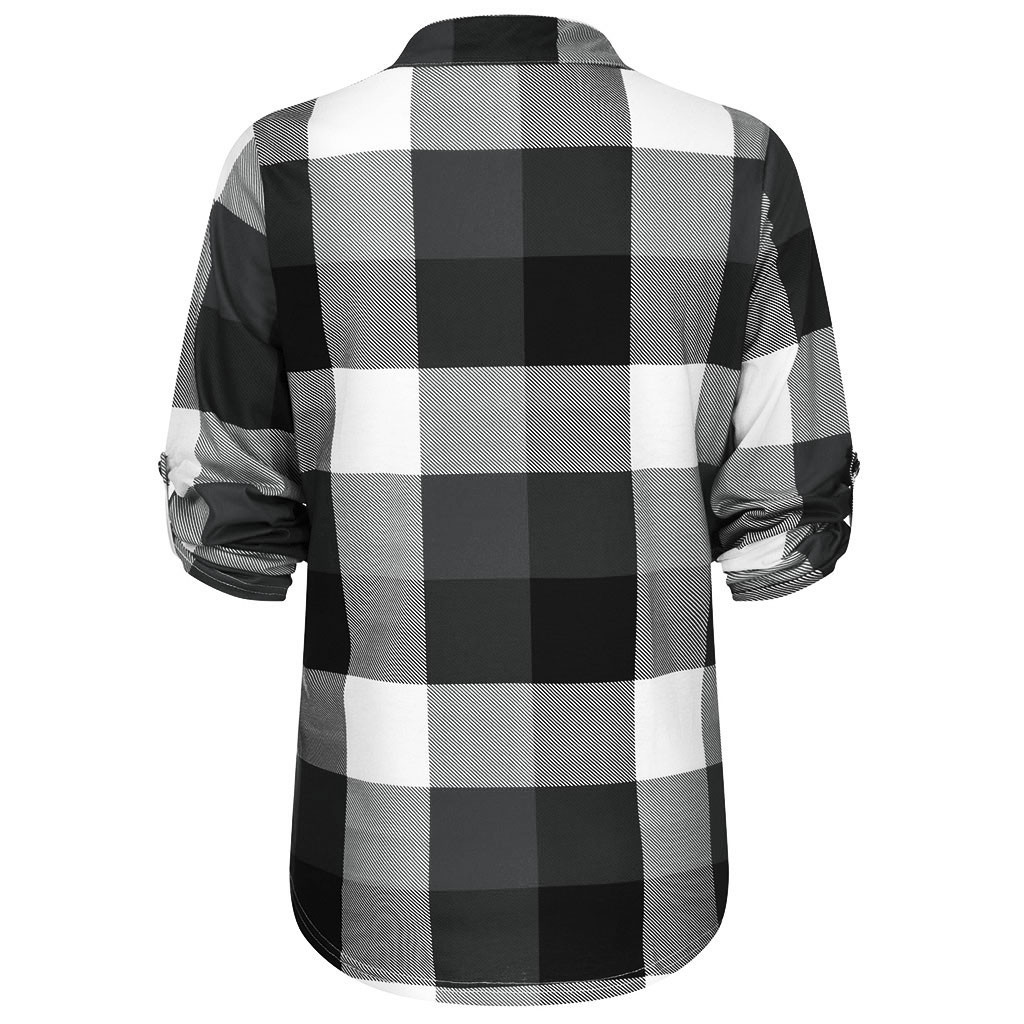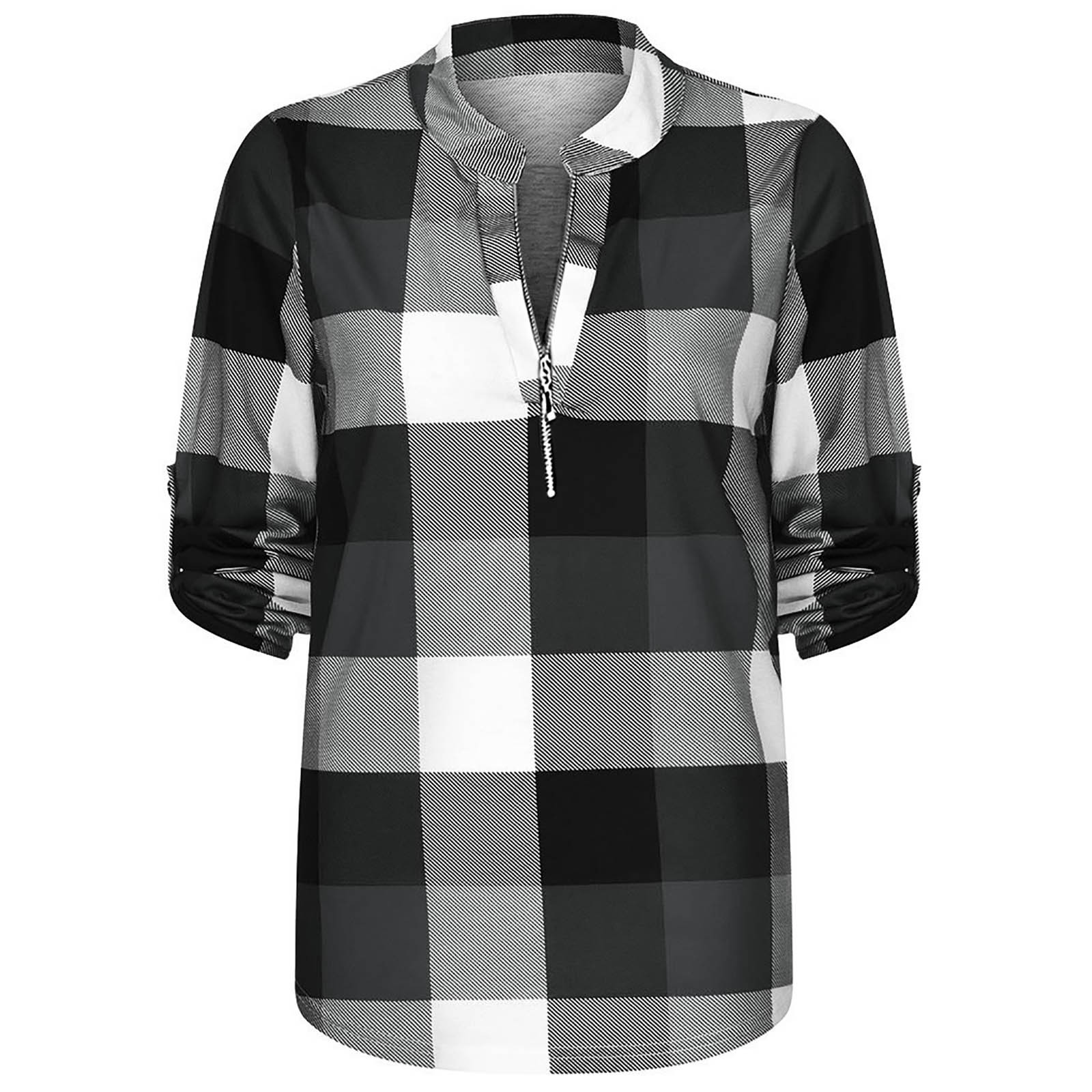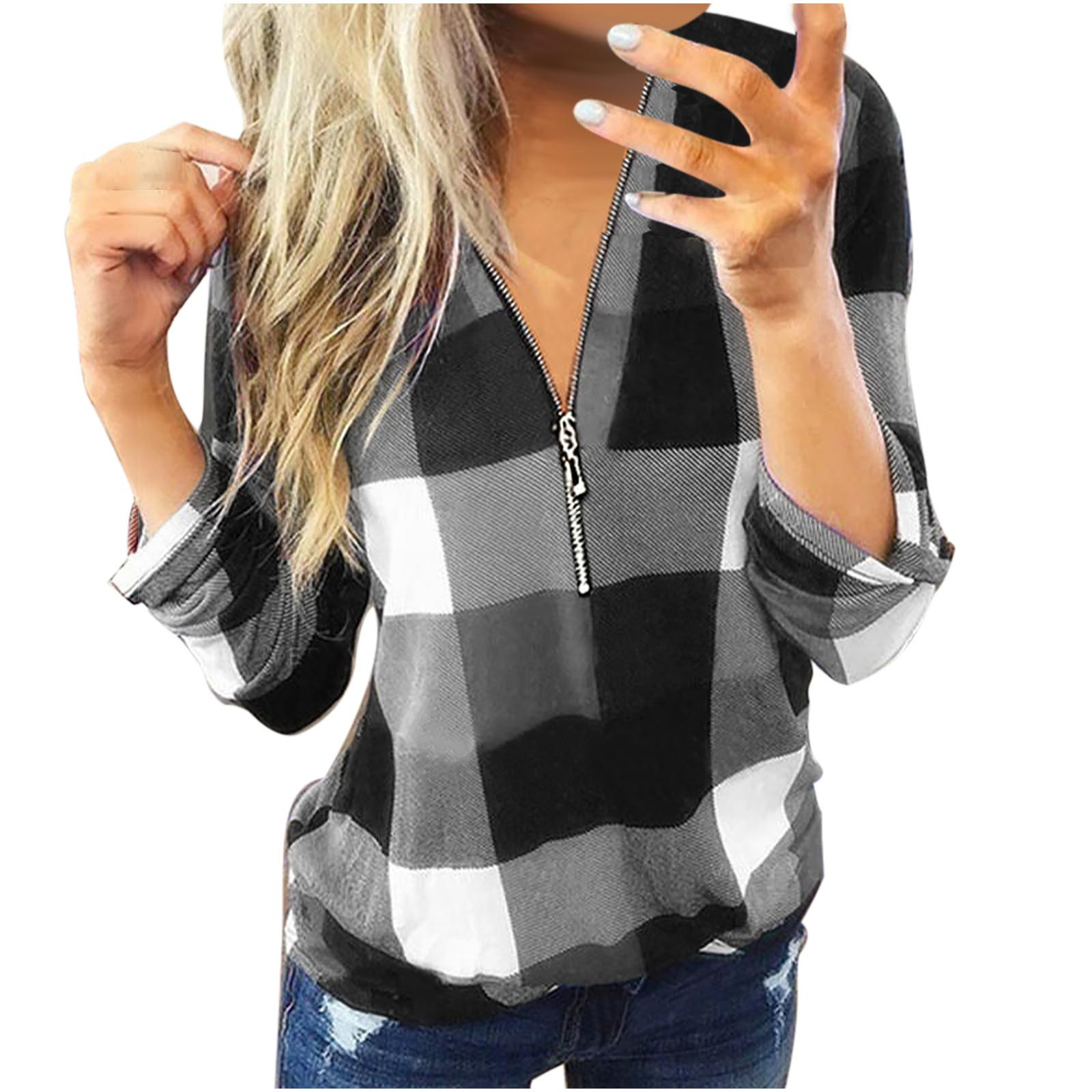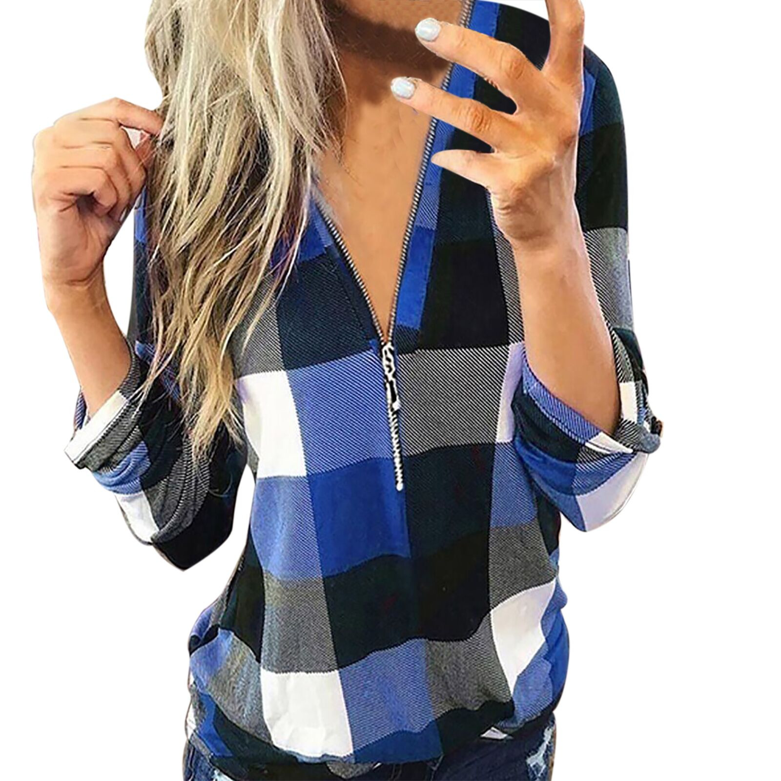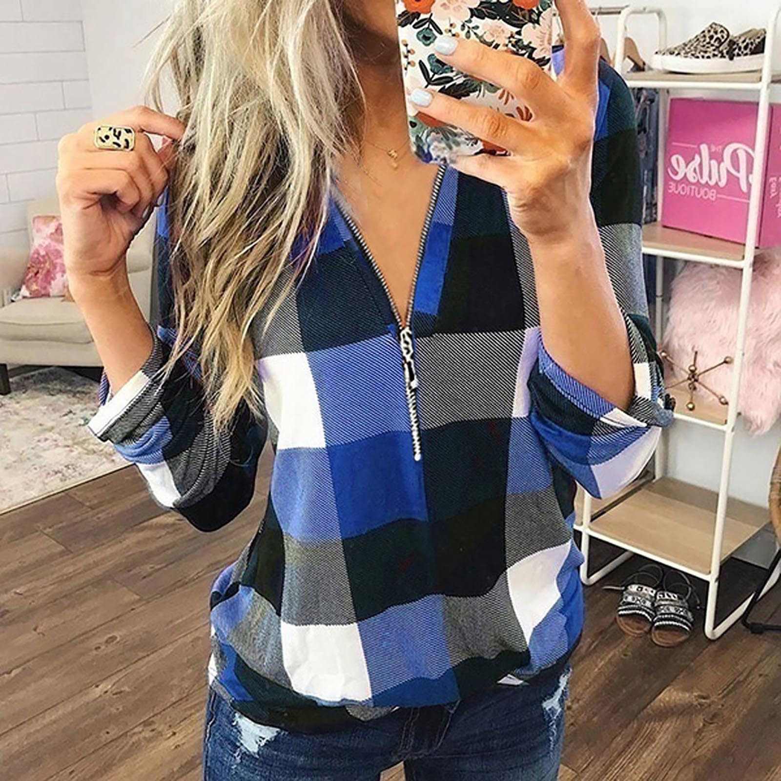 S-XXXL Autumn Winter Fashion Womens Casual V-Neck Zipper Plaid Printed Long Sleeve Shirt T-shirt Tops אישה חולצות All-match F4