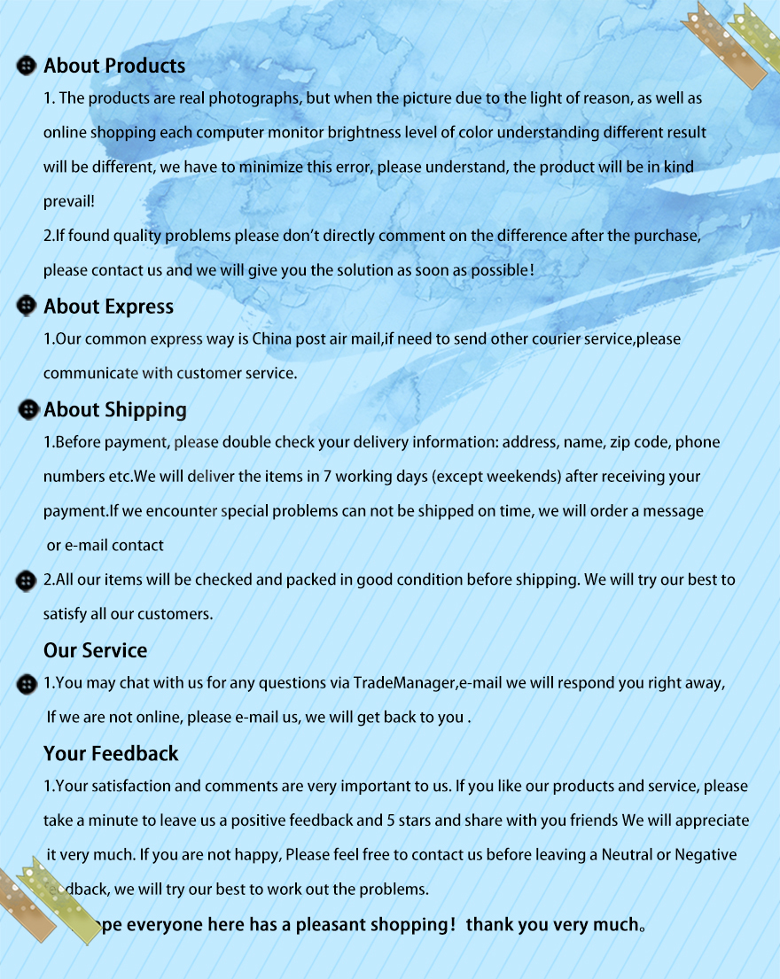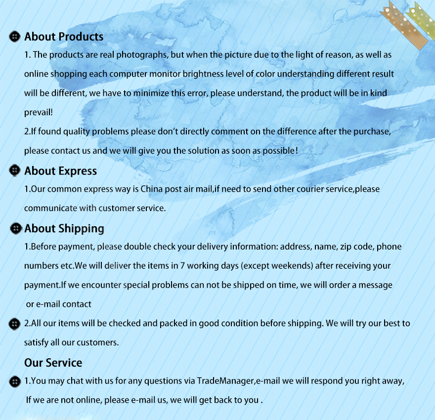 1.Due to the lighting and display reasons, little color difference is normal ,please forgive